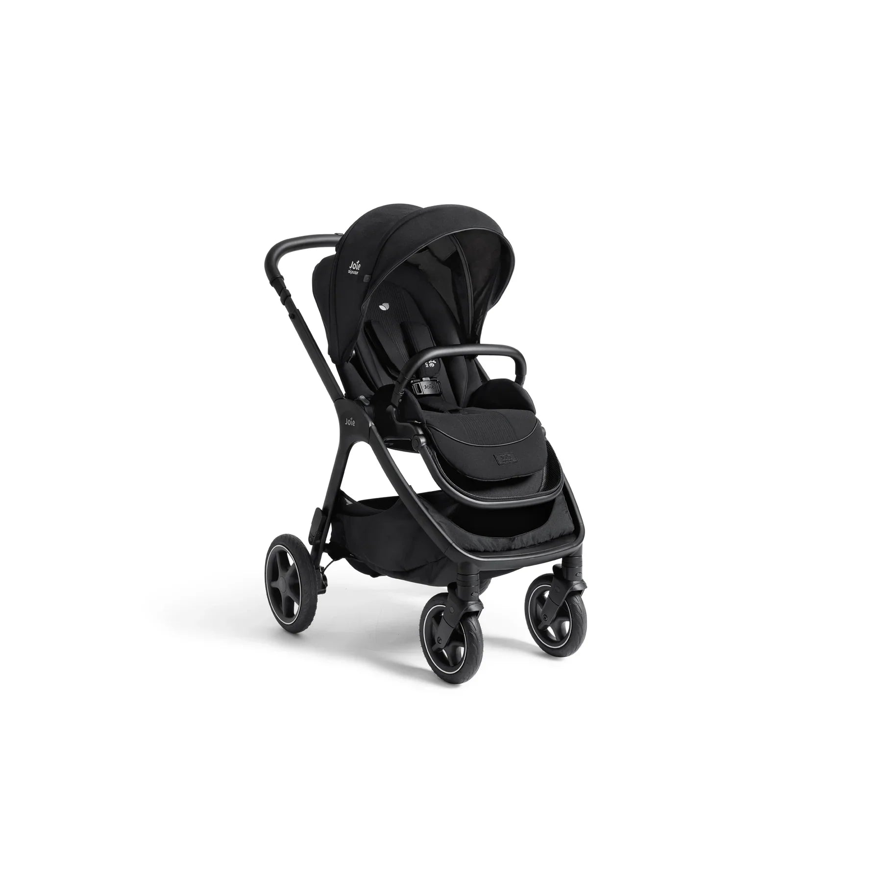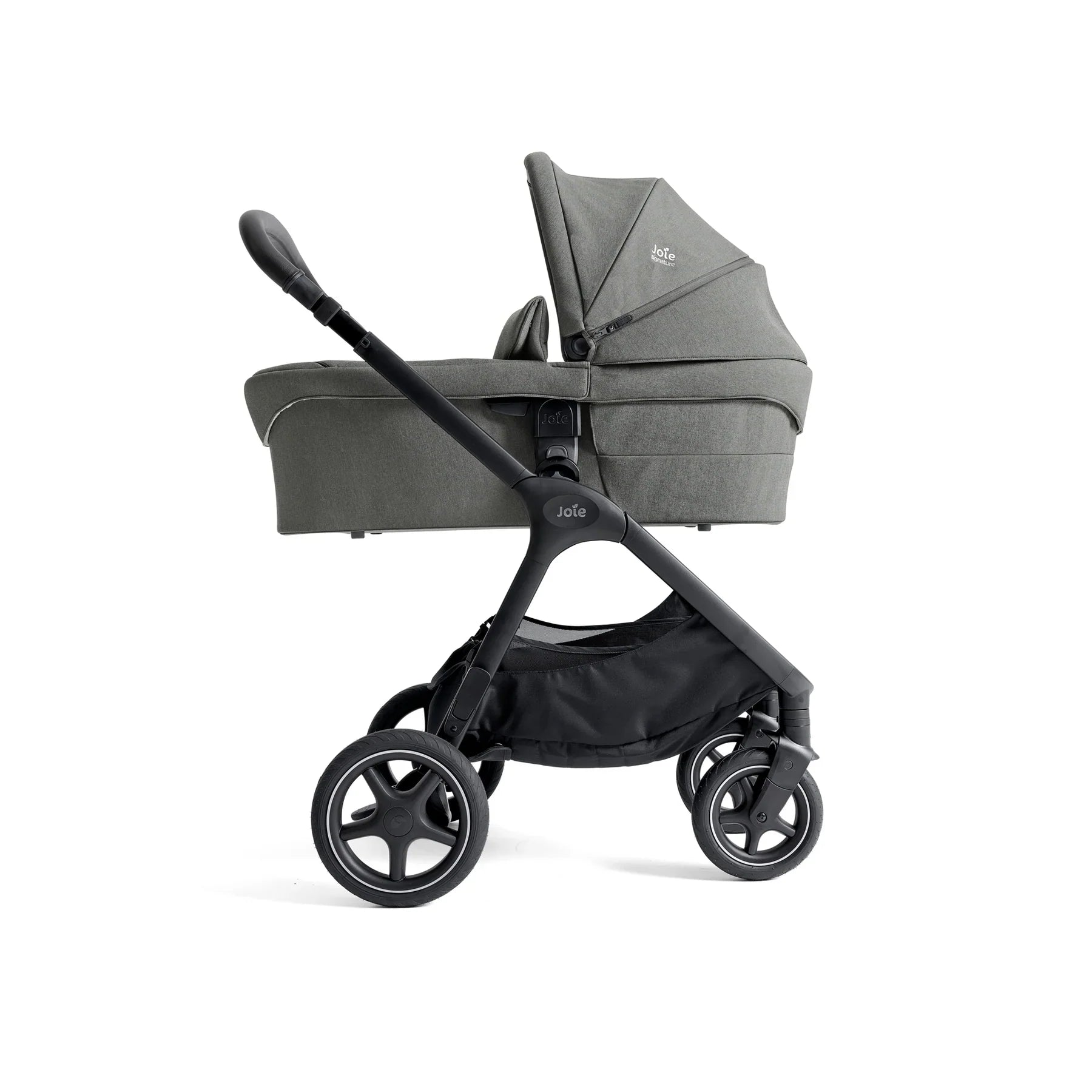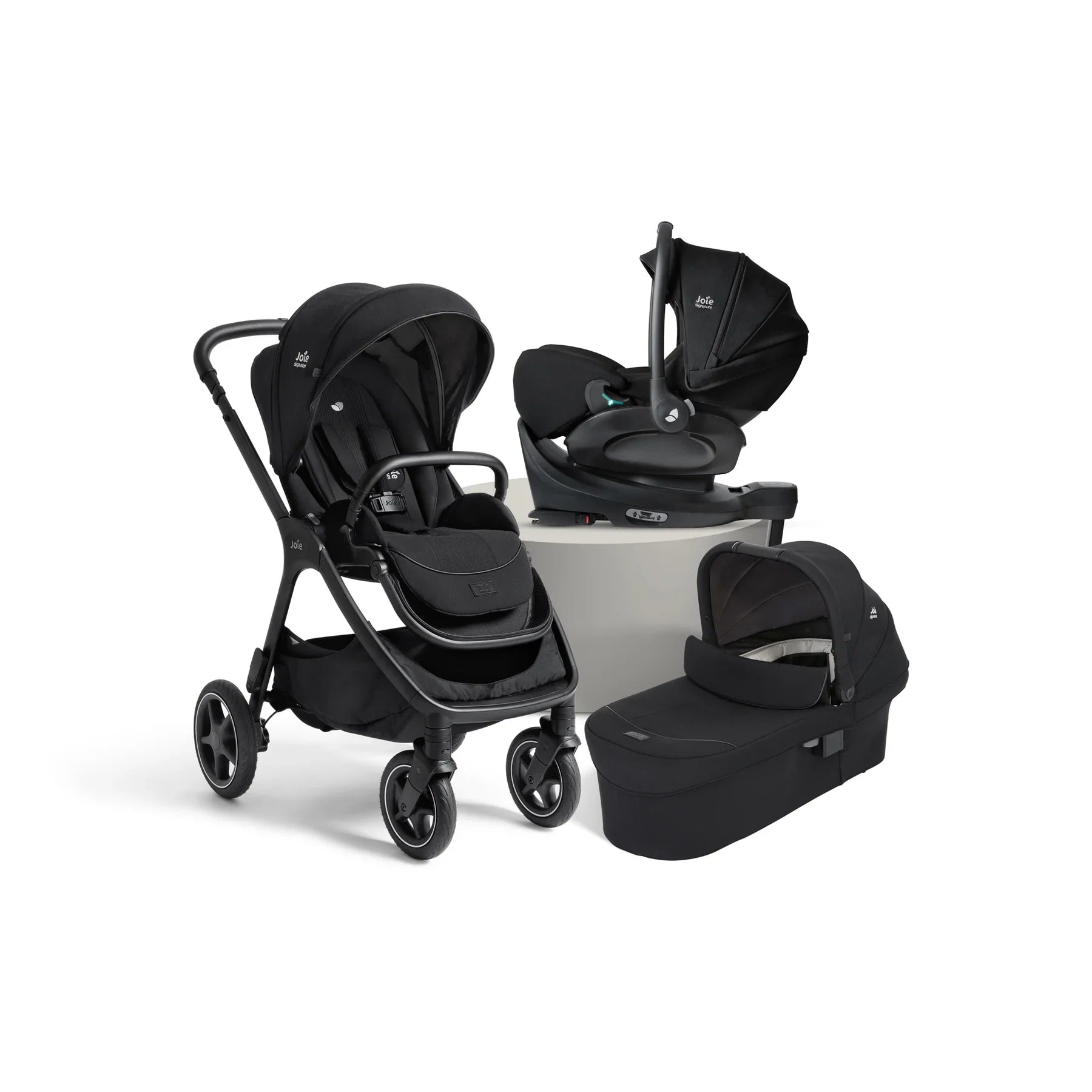 The Joie Finiti Travel Ready Signature Bundle comes with the finiti pushchair, i-Level Pro infant carrier, ramble XL carrycot and i-Base encore spinning car seat base.